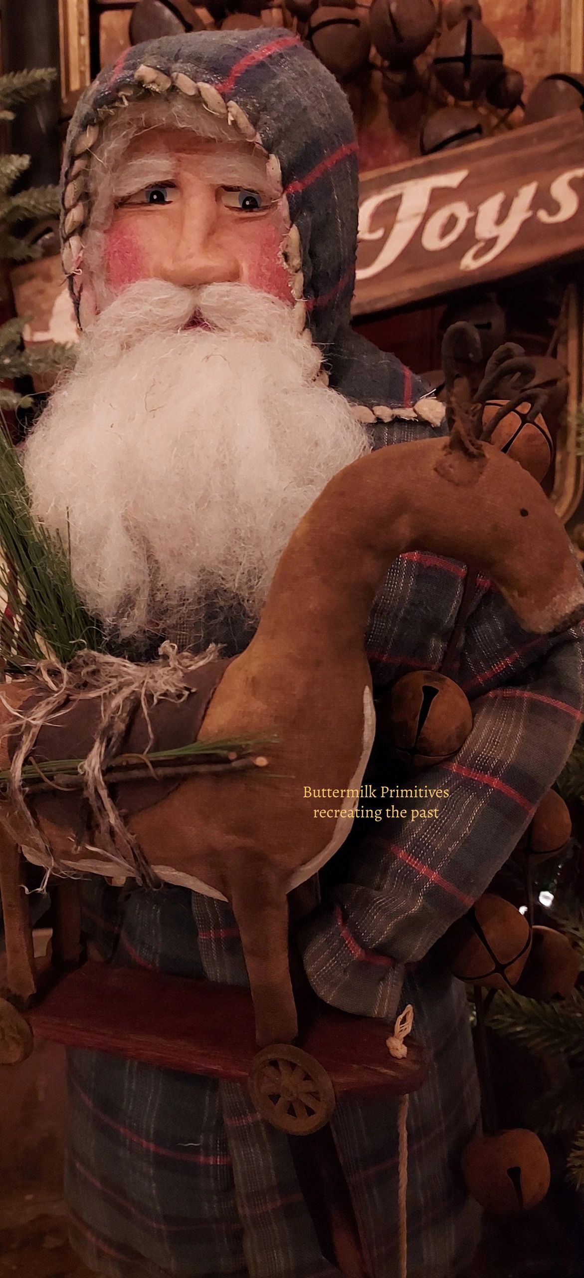 My signature handmade primitive toys the Santas hold and candy canes using a cotton spun technique and vintage fabrics are just a few of the details you will enjoy in my work. Distressed genuine leather belts, rusty jingle and sleigh bells can be expected too!